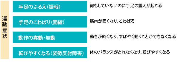 安静時に手足がふるえる(振戦)、筋肉が固くなり手足がこわばる(固縮)、動きがにぶくなり動作が遅くなる(無動)、体のバランスが悪くなり転びやすくなる(姿勢反射障害)、といった症状がみられます。このような運動症状によって、顔の表情が乏しくなったり、小声、小書字、屈曲姿勢、小股・突進歩行などがおこります。