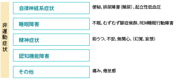 上記の運動症状以外にも、便秘や立ちくらみ(起立性低血圧)などの自律神経症状や睡眠障害、不安や気分が落ち込むなどの精神症状があります。